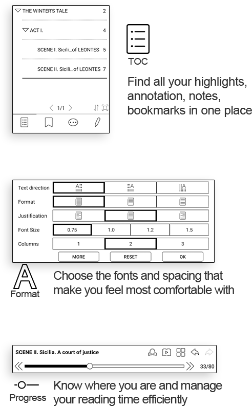 | Supported file formats | TXT, HTML, RTF, FB2, FB2.zip, DOC, DOCX, PRC, MOBI, CHM, PDB, DOC, EPUB, JPG, PNG, GIF, BMP, PDF, DjVu, MP3, WAV, CBR, CBZ |