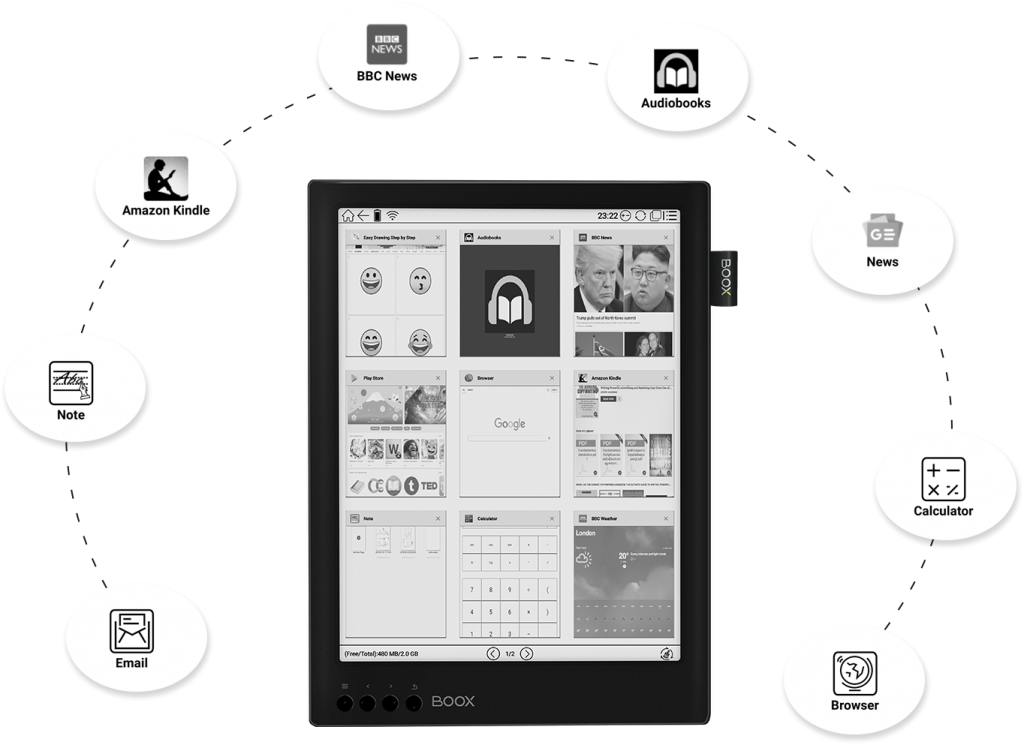 與封閉的基於Linux的E Ink電子閱讀器不同,BOOX Max2擁有Android 6.0,它賦予了BOOX前所未有的功能,為您最大化Max2的價值。