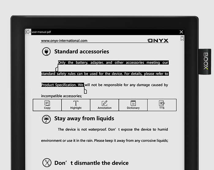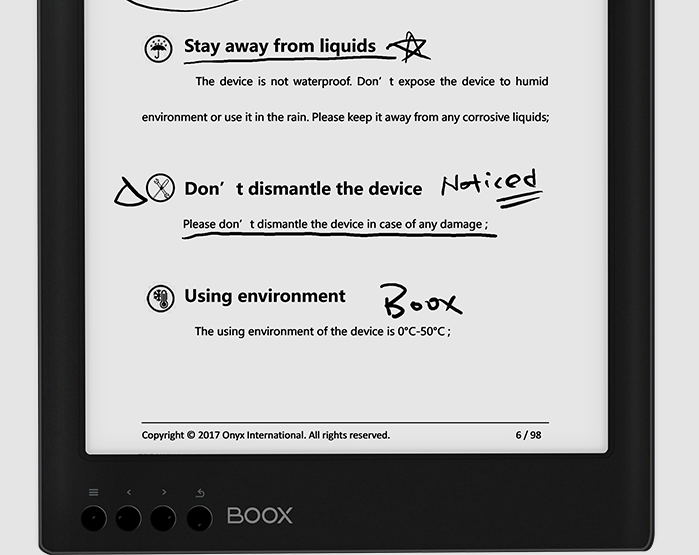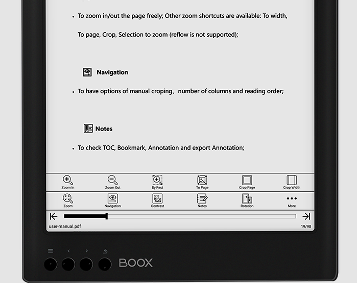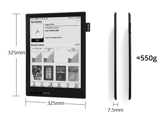 Max2屏幕尺寸非常適合閱讀大型PDF書籍。 無需縮放和滾動,它顯示原始書籍大小。 在Max2上,您可以享受BOOX電子書閱讀器豐富的閱讀器功能:書籤,高亮,註釋,塗鴉筆記,重排,調整字體和對比......以及更多的知識。