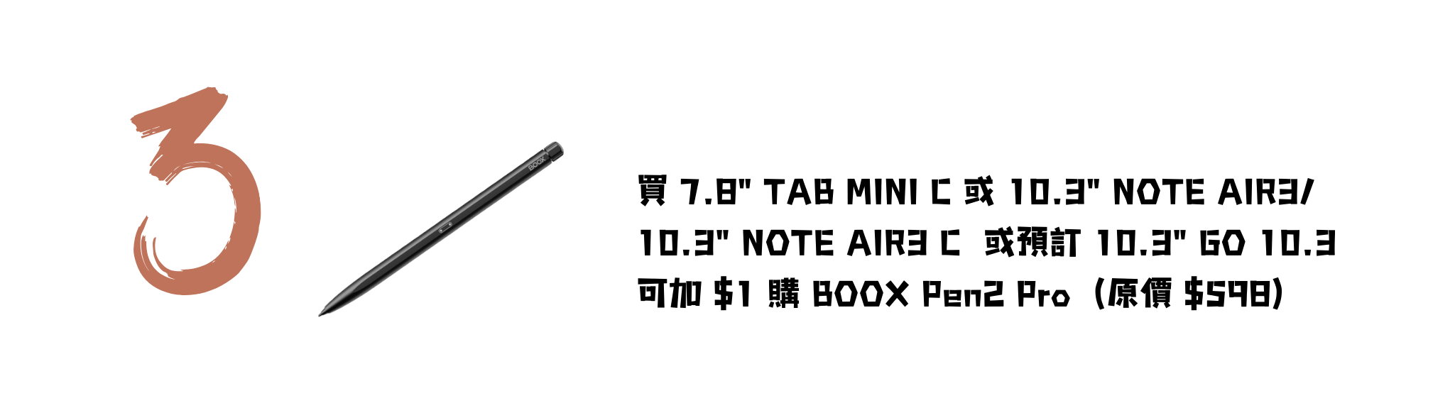 於優惠期內經香港官網下單購買7.8” Tab Mini C,10.3" Note Air 3,Note Air 3 C 或 下單預購全新10.3” Go 10.3, 即可以特惠價 $1 購買 BOOX Pen2 Pro 黑色 帶橡皮擦手寫電磁筆 (原價 $598).