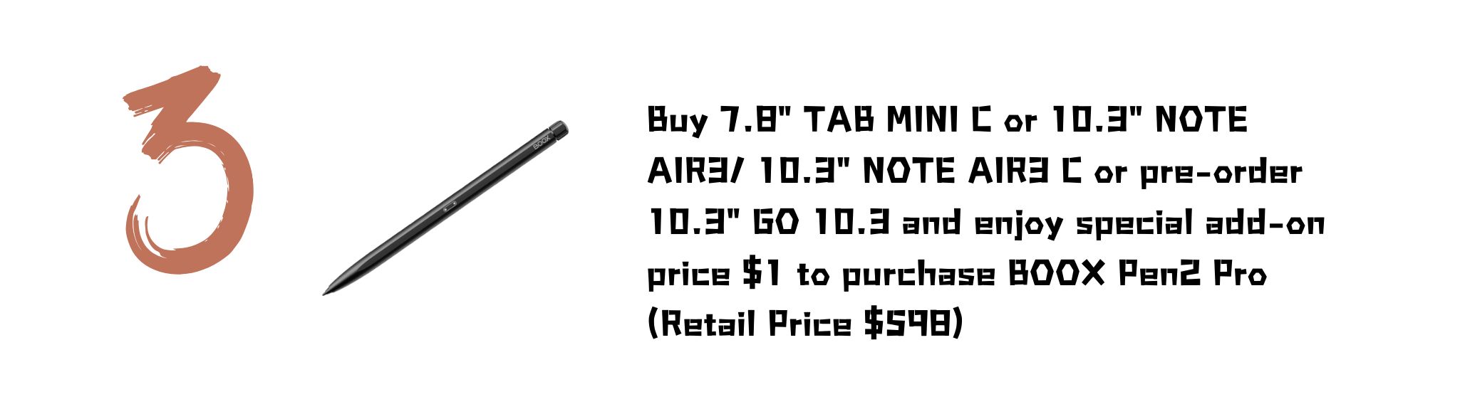 During the promotion period, place an order for 7.8” Tab Mini C, 10.3" Note Air 3, Note Air 3 C or pre-order the brand-new 10.3” Go 10.3 through the Hong Kong official website, to be eligable to purchase the BOOX Pen2 Pro magnetic pen with eraser at special price of $1. (Retail Price $598).