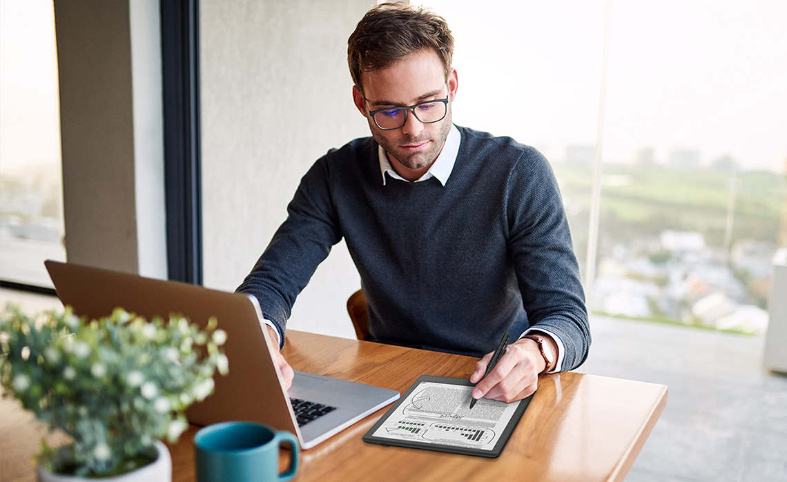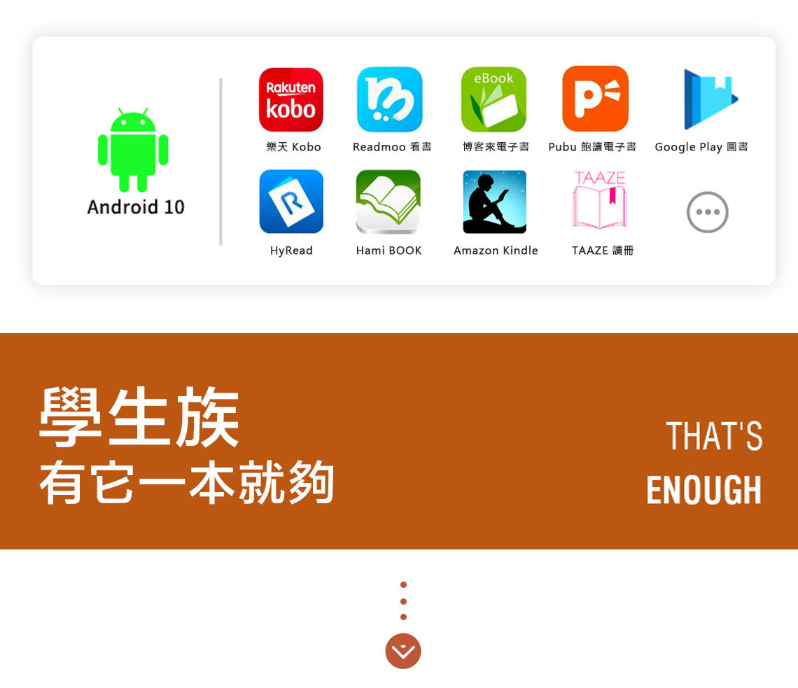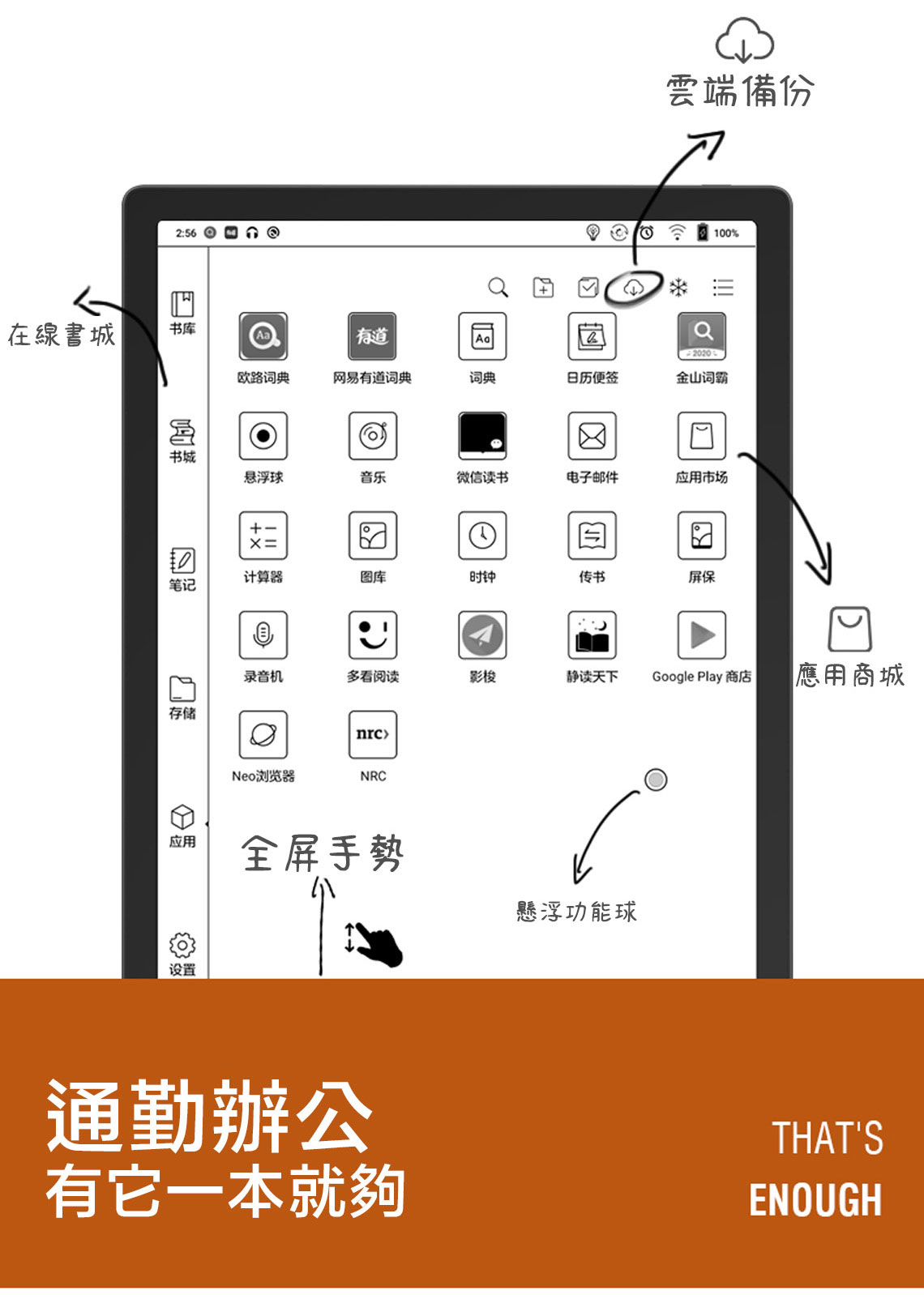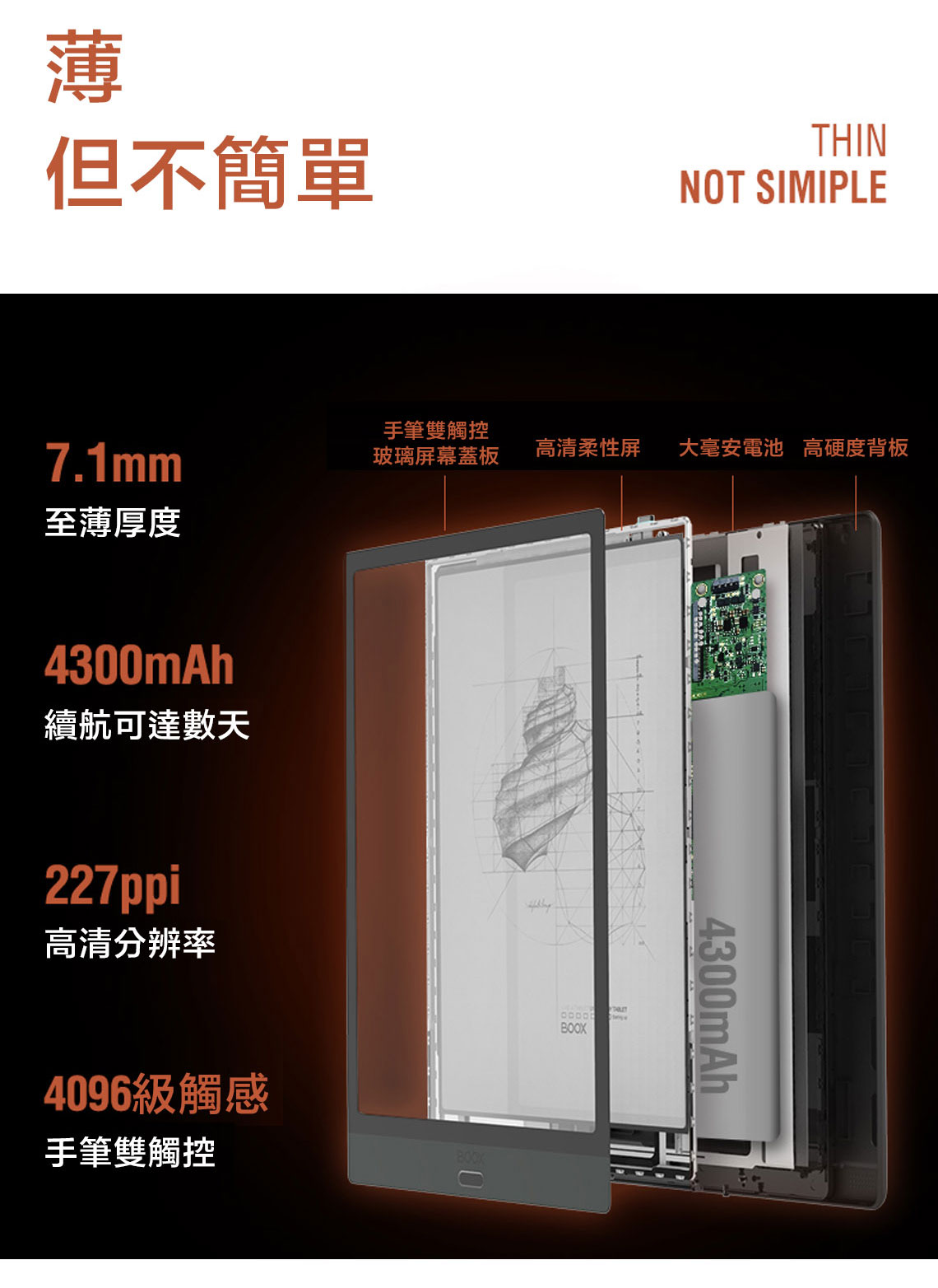 內建各種小工具程式與支援多國語言,加入流暢的全新 X 高速刷新技術,輕鬆融入你的生活 ; 僅有 378g 的輕盈,即使是使用在各種場合也能輕鬆運用 : 旅遊、會議、學習、展示、素描...等,左手或右手,無論哪一手都能輕鬆單手操作。