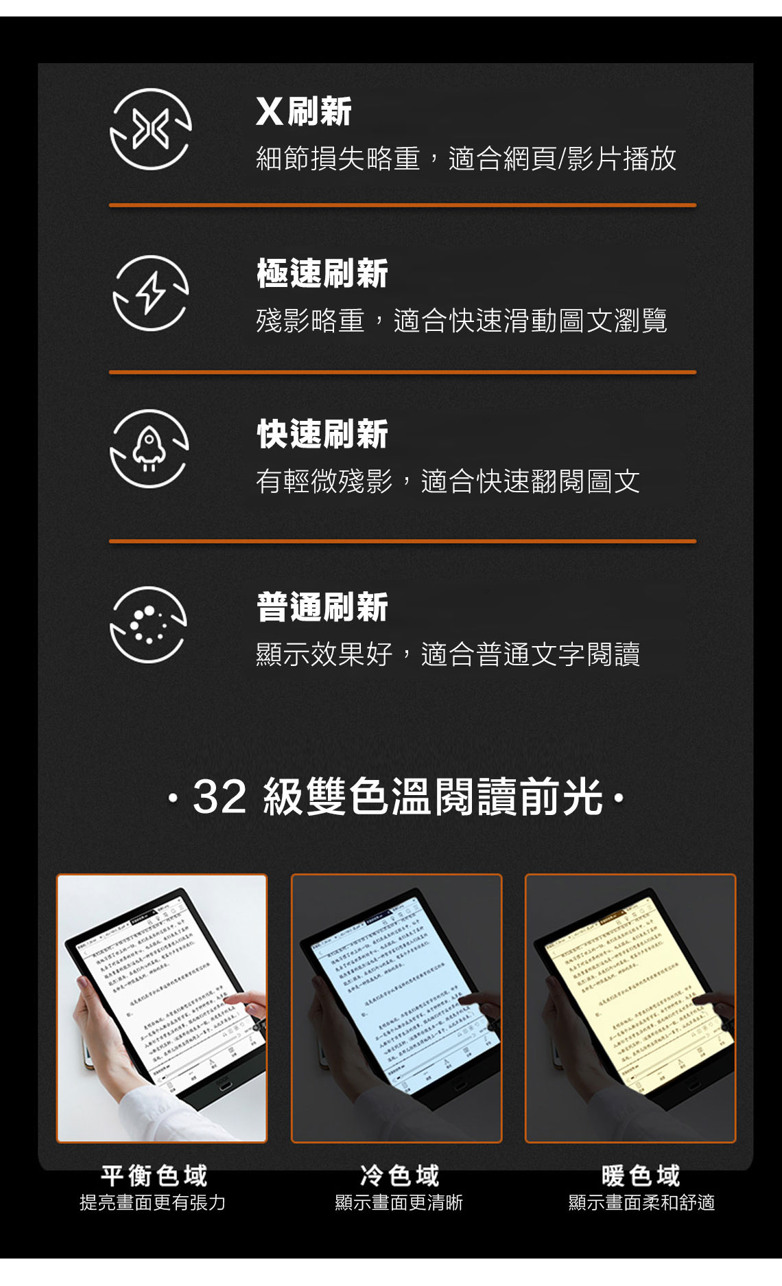 BOOX Note3 10.3 吋電子閱讀器,結合電子書與電子筆記功能,結合你的專業,延伸多元使用 ; 搭載全新科技 E Ink 純平高清墨水屏、前螢幕閱讀燈光源可依環境調節色溫,有效降低藍光造成的傷害,與減少長時間使用 3C 設備的疲勞,即使在陽光下也無眩光,讓閱讀更加舒適。