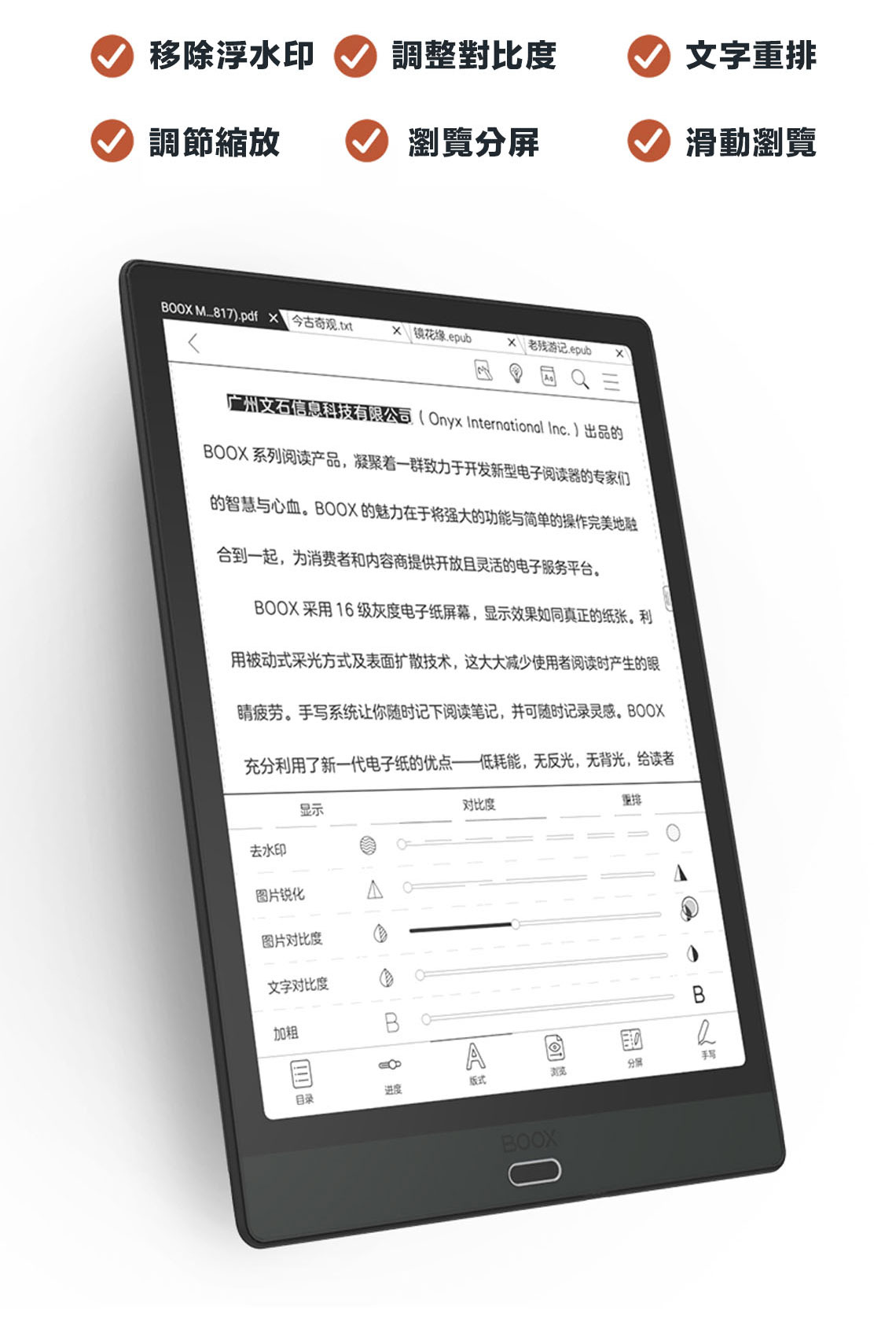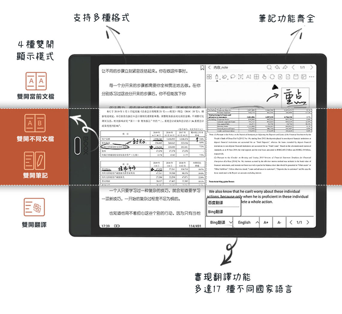 BOOX 全新升級 Neo Reader 3.0,檔案多格式支援,PDF 也可輕鬆閱讀,更結合筆記模式 ; 雙開文件多工作業,邊寫邊讀、關鍵字搜尋 ; 搭配內附的電磁觸控筆,劃線與註記強化你記憶力,隨手寫下心得,讓書籍不再過目而忘 !