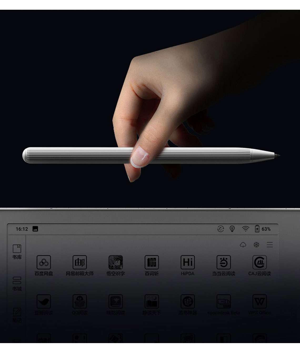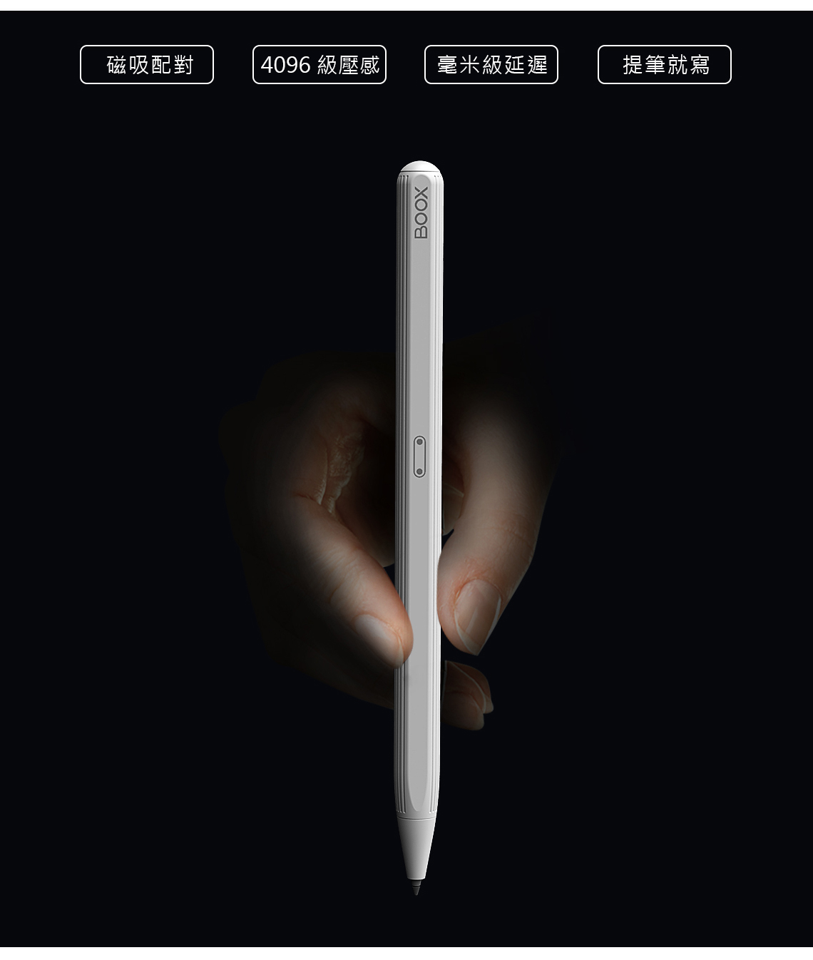 單手握持手感舒適,即便是女生也能輕鬆掌握,搭配磁吸式手寫筆可隨手筆記,輕輕一吸即可收納,將為您的閱讀器增添更具時尚的設計感。
