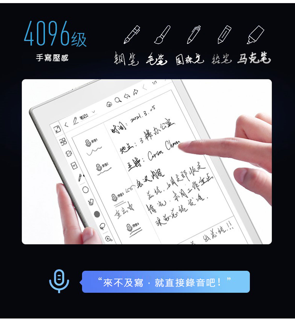 多種智能筆觸效果、粗細、顏色效果自定義,豐富選擇多採導出。筆鋒隨壓感而變化,AI 識別手寫一鍵轉文件檔案。來不及寫,還能插入錄音。