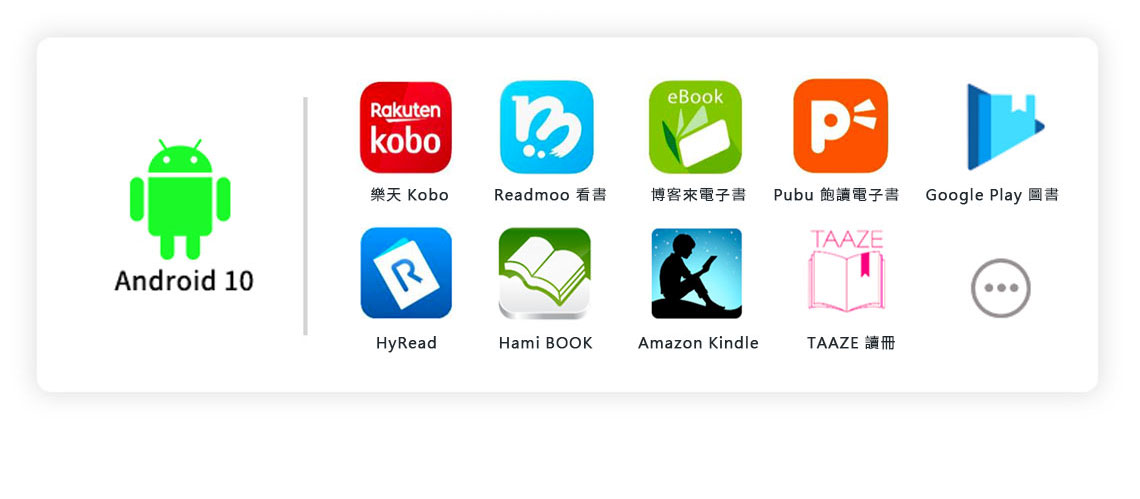 開放式的 Android 10.0 系統,可跨平台載取書籍,讓閱讀成為生活的一部份!Kobo、HyRead、博客來、readmoo、國家圖書館、Hami、Pubu、mybook …等電子書城應用程式,BOOX 文石閱讀器透過 Google Play 輕鬆裝載你想要的軟體。