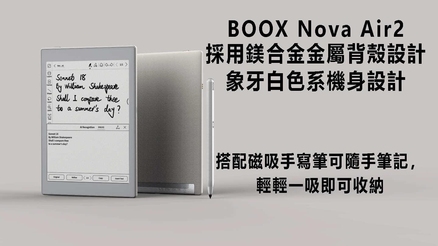 BOOX Nova Air2 7.8 吋電子書閱讀器,採用鎂合金金屬背殼設計,宛如藝術品級的電子閱讀器。象牙白色系機身設計,讓閱讀者更加的專注,達到純淨的閱讀體驗,也讓整體感螢幕更加的明顯舒適。單手握持手感舒適,即便是女生也能輕鬆掌握,搭配磁吸手寫筆可隨手筆記,輕輕一吸即可收納,將為您的閱讀器增添更具時尚的設計感。