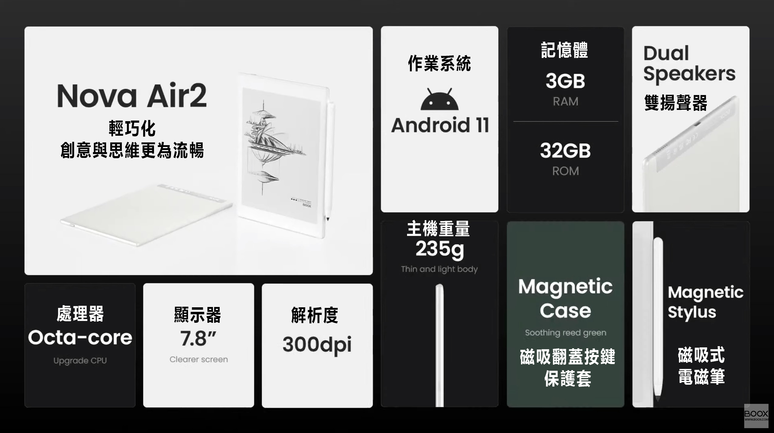 2022 全新上市 文石 Nova Air2 7.8 吋電子閱讀器,機身採用鎂鋁合金材質,清透優雅柔白,輕巧舒適長時間,單手持握也不覺得累,符合人體工學操作的電子閱讀器。可使用 Google Play 安裝多種 Android 應用程式,你想要的筆記、繪畫、閱讀,它完全發揮強大的任務處理功能。